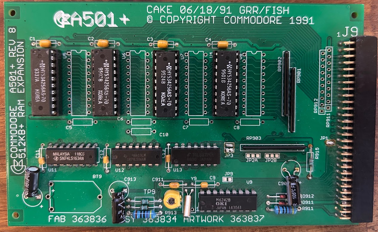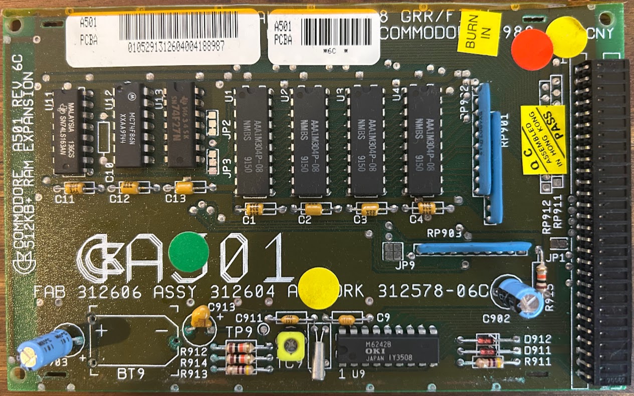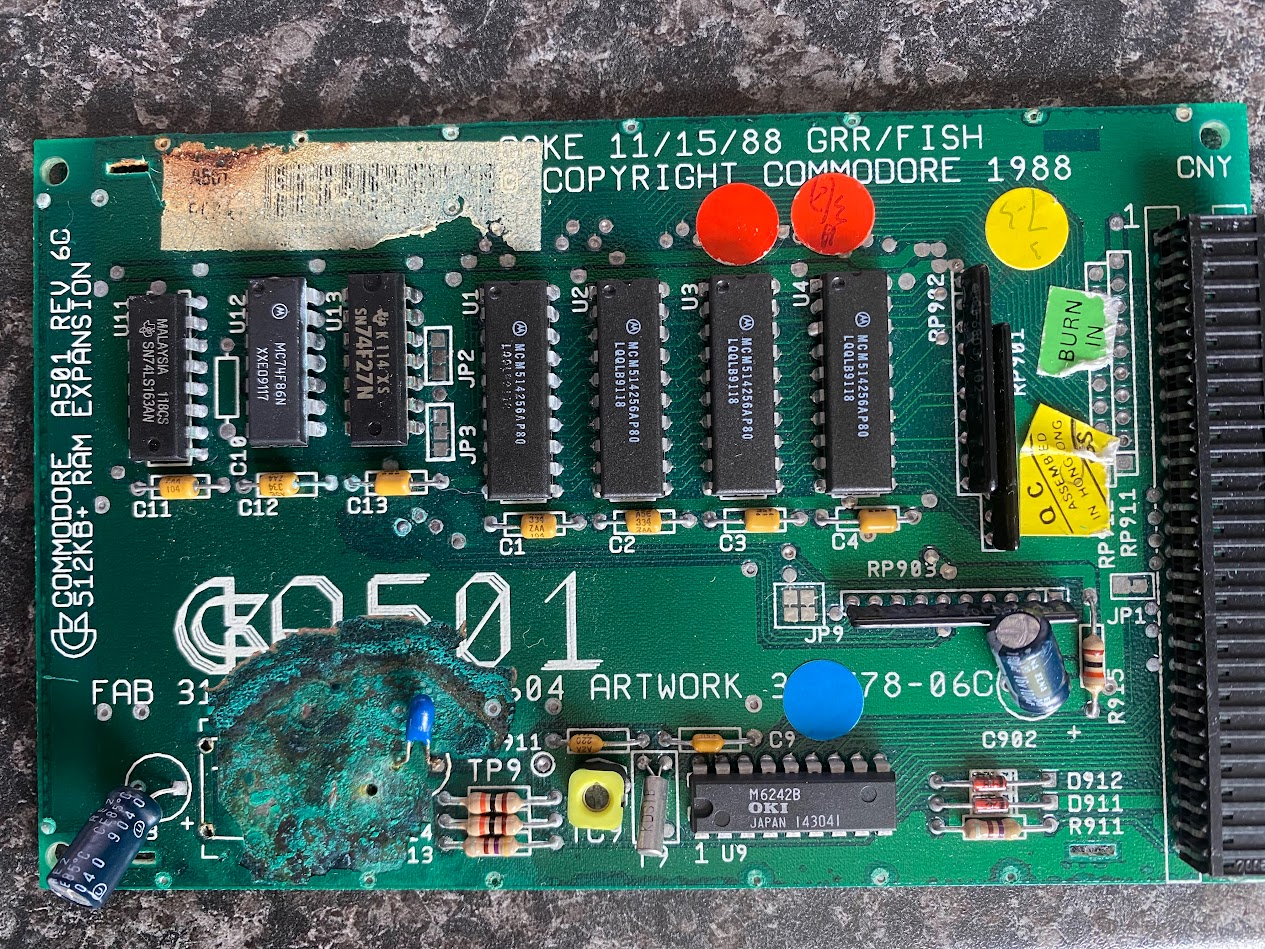 This was my first time building something from scratch for the A500. I decided on the A501 RAM expansion board because it was cheap to get made at PCBWay, was going to be easy for me to solder and allowed me to re-create an old Amiga component which is just about always damaged by battery electrolyte. While there are no end of A500 RAM expansion boards I really wanted the original Commodore factory look.