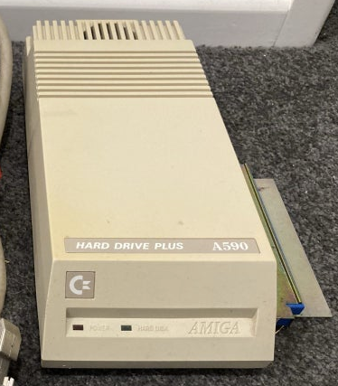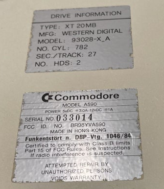 My second A590 looked a much nicer shade of beige rather than yellow. This one came with an original Commodore PSU. V6.0 ROMs, no RAM and the same Western Digital XT hard drive.