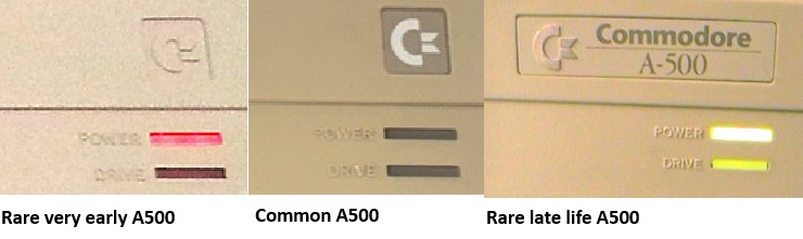 Looking at case designs there's 3 key difference which can be seen below. The very early C= logo is moulded into the case. This didn't seem to last long, and Commodore soon changed to an inserted logo. Right near the end of its lifecycle, likely as they were preparing to introduce the A500 plus and found they had excess parts for the standard A500 released some with what was very likely the A500 plus case but with a different insert.